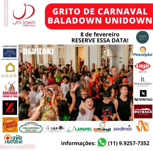 No domingo, 8, o Instituto Unidown, entidade sem fins lucrativos que desenvolve atividades com jovens e adultos com Síndrome de Down, realiza, em parceria com a União Fraterna, o Grito de Carnaval Baladown. O evento acontece no salão nobre da União Fraterna, na Rua Guaicurus, 27 – Água Branca, das 14h às 17h. Ingressos antecipados até 6/2 custam R$ 30,00 por pessoa. Portadores de Síndrome de Down e crianças até 10 anos não pagam. Mais informações pelo Whatsapp: (11) 99257-7352.
